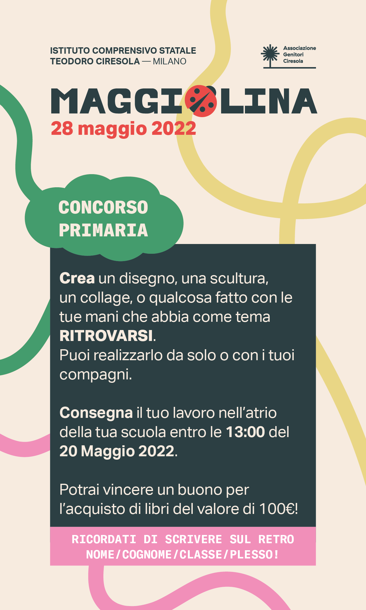MAGGIOLINA 2022 | RITROVARSI | 44° EDIZIONE SAVE THE DATE 28/05/2022 E’ ufficiale: il 28 Maggio prossimo ci sarà la festa di fine anno della nostra scuola! La MAGGIOLINA sarà un grande evento che coinvolgerà tutte le famiglie, le bambine e i bambini, le ragazze e i ragazzi e tutto il personale della scuola.